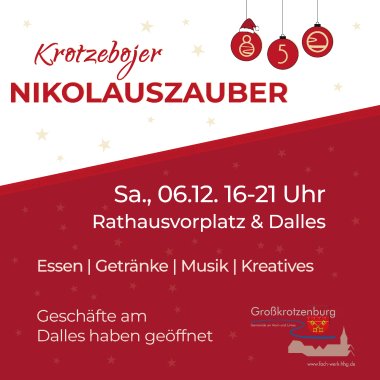 Der Krotzebojer Nikolauszauber ist eine gemeinsame Veranstaltung der Gemeinde Großkrotzenburg und des fach-werk-hhg und findet von 16:00 bis 21:00 Uhr auf dem Rathausvorplatz und dem Dalles statt.